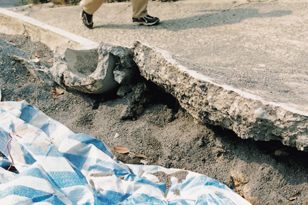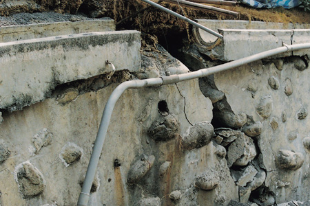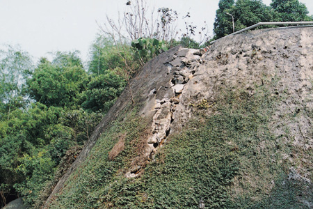 | 照片 A-04-A1 周圍環境基地後方邊坡的擋土牆過高, 受震後開裂,