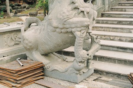 照片 A-04-A10 庭園大雄寶殿前的兩旁石獅子於大地震時被震落。 |