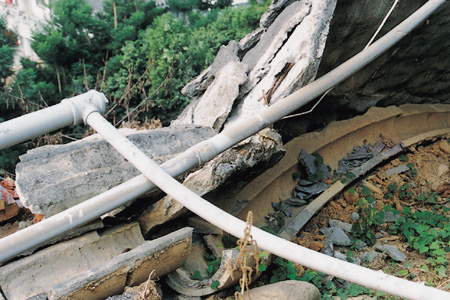 | 照片 A-04-A2 周圍環境基地後方邊坡擋土牆的水土保持設施受到破壞。 |