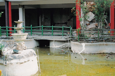 照片 A-10-A8 庭園女眾大樓庭園水池除了外表裝飾損壞外, 部分水池邊緣表面開裂造成漏水現象。 |