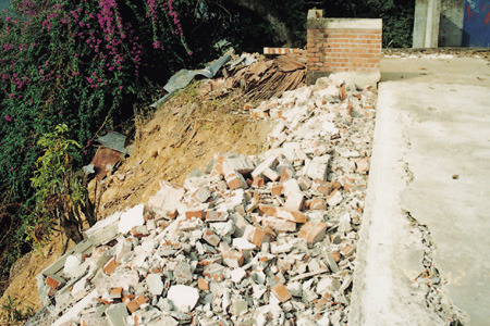 | 照片A-11-A3 周圍環境邊坡滑動造成疊砌磚牆傾倒毀壞。 |