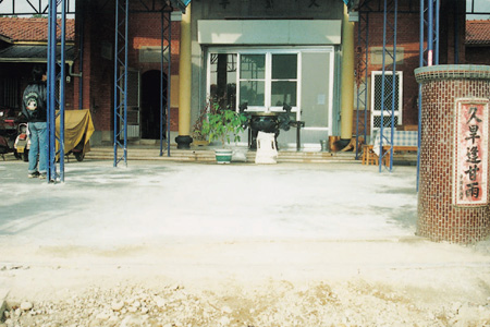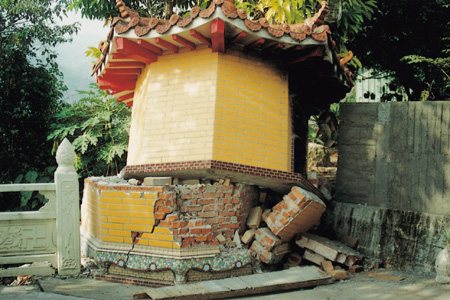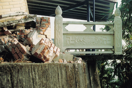 照片A-11-A8 庭園疊砌磚造金爐抗剪力差,故受到嚴重損壞。 |