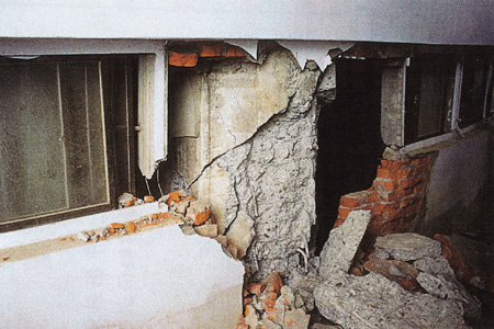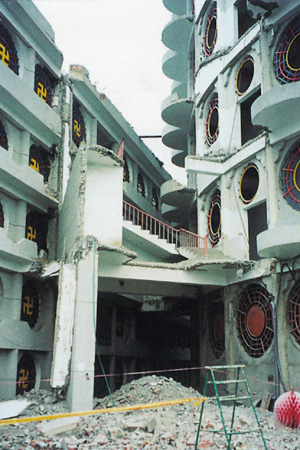 | 照片B-02-1樓層剛度不均,且內環柱都因氣窗開口部而有極短柱現象,加上未妥善配置不同性質之結構材料,為結構系統十分不良之建築。 |