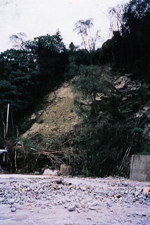 (1)基地位於山坡,地震時地層滑動,導致基地後方山坡土石往基地方向滑動。
