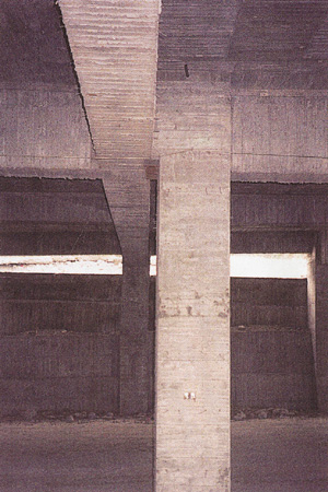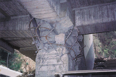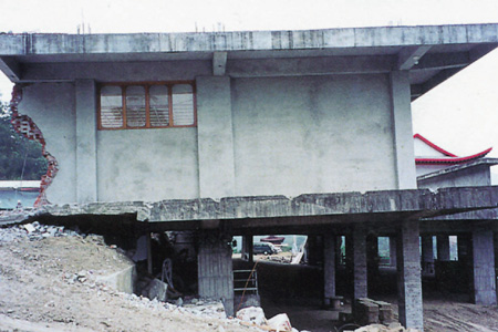 (6)地層滑動加上建築物結構系統不良,使得停車空間大部分的柱子在柱頭位置產生嚴重破壞,不但鋼筋挫屈,混凝土也遭壓碎。