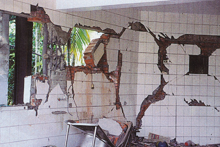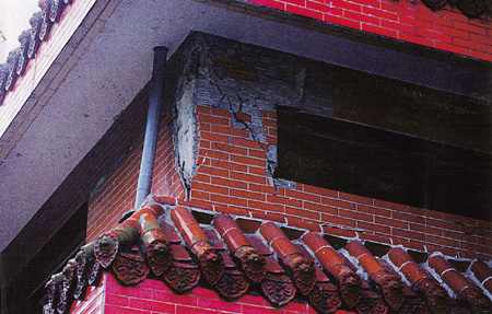 (3)窗戶間之柱子因短柱效應而遭剪壞,剪壞後之柱內可發現配管,而填充磚牆則因地震力來回作用而產生嚴重X型裂縫。