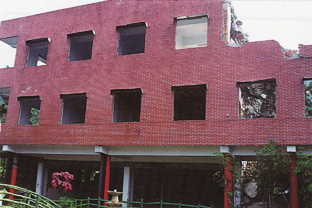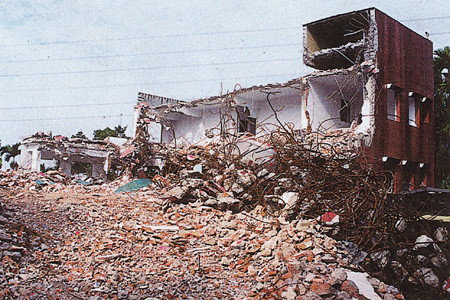 (2)樓層剛度變化過大,且上下樓層牆體不連續,加上地震震動與地層滑動之側向力,導致建築物嚴重崩塌。