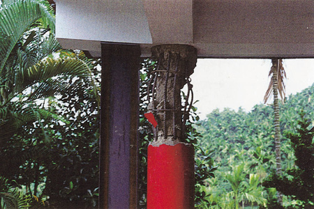 (2)底層柱子箍筋間距過大,喪失圍束柱內混凝土之功能,導致柱子無法發回效能而在地震中遭到剪壞,目前柱子旁都利用型鋼柱作緊急的臨時支撐。